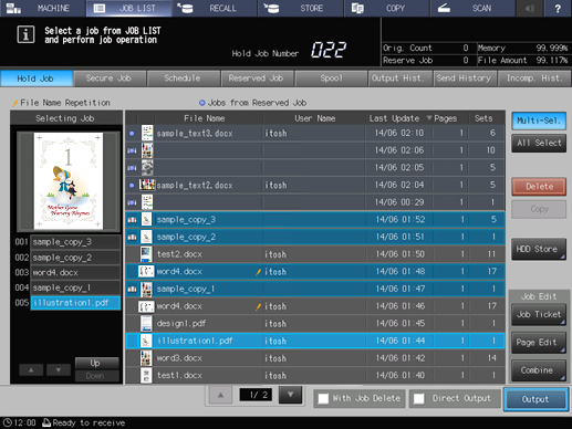 • supplementary explanationIf a job that was moved from the reserved job exists, Jobs from Reserved Job is displayed in the top center of the list. Jobs moved from the reserved job cannot be stored on the HDD. For these jobs, a round blue icon is displayed to the left side of the preview icon. If any of these jobs exists, it is listed separately from other jobs.