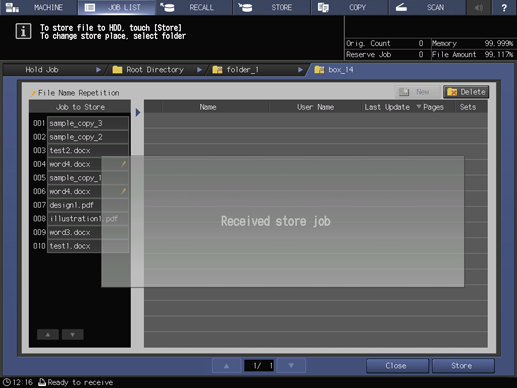 The machine stores the job selected in step 3 onto the directory specified in step 5 of the HDD.