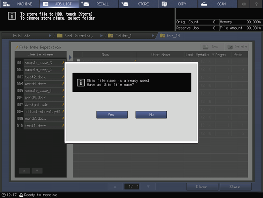 • supplementary explanationIf the file name of the job has been duplicated, a confirmation dialog will be displayed. Press Yes to save it or press No to cancel.