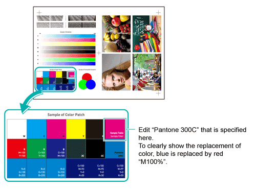 "Pantone 300C" in "Sample of Color Patch" for sample B is used as an example. The blue color in "Pantone 300C" is replaced by "M100%" for printing.