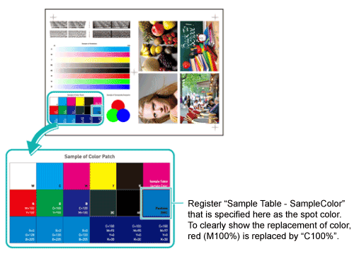 "SampleTable - SampleColor" in "Sample of Color Patch" for sample B is used as an example. Register a spot color called "Sample Color" and print out the original image with its red color replaced with "C100%."