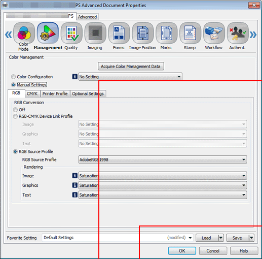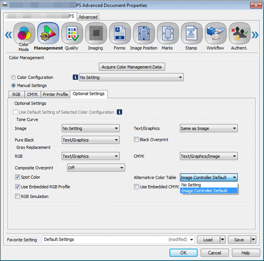 supplementary explanationIt is recommended that frequently used color output settings be registered in the color configuration. (Refer to About Color Configuration.)