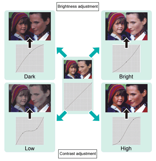 Using Color Centro, you can adjust the tone curve (I/O density curve for CMYK colors) to adjust the color tone, brightness, and contrast of the whole page.