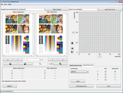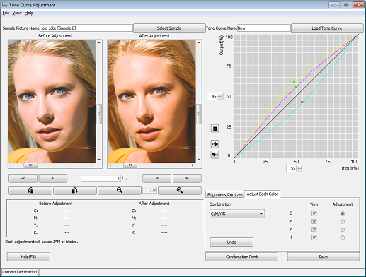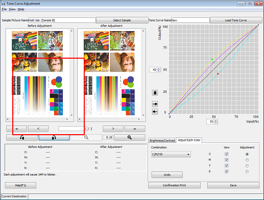7. Under Adjustment, select the radio buttons of the colors that you want to adjust (C/M/Y/K). Click on the tone curve and drag the displayed handle (operating point) to adjust the tone curve.