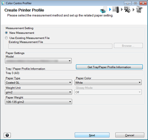 Select New Measurement under Measurement Setting and click Get Tray/Paper Profile Information.