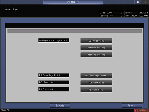 Outputs a list of Color Setting, Network Setting, and Machine Setting.
