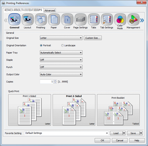 In Windows, to open this window, in the Print dialog box, click Properties (or Preferences), or right-click the printer icon in the Printers, Devices and Printers, or Printers and Faxes window. Then specify Printing Preferences.