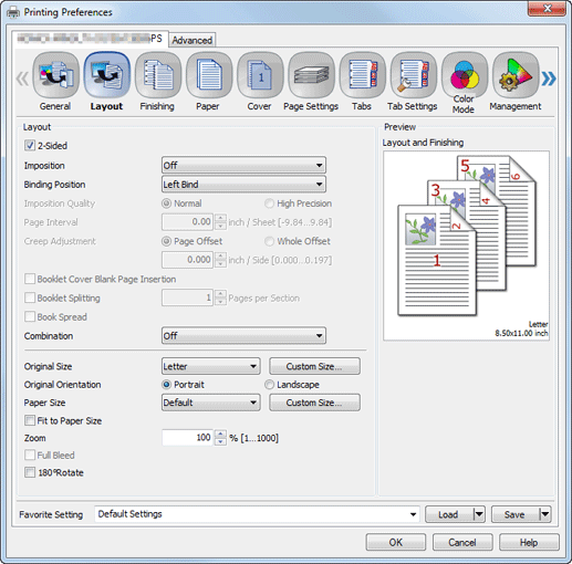 Original Size | The paper sizes registered as the standard paper sizes and custom sizes | Set a paper size of the original. When you select the PostScript Custom Page Size, the size specified by Custom Size is used. In addition, when you register the Custom Paper Size Name using the Custom Size - Add Custom Size, you can also select the name of the size. |