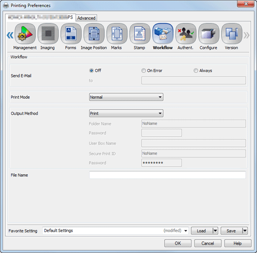 Output Method | Print, Print/Hold, Hold, Hold (Without RIP), Print/Store on HDD, Store on HDD, Secure Print, Form | Select the method to handle a print job that is to be sent from the computer to this machine. When Print/Store on HDD, Store on HDD, or Secure Print is selected as the method, you need to enter Folder Name, Password, User Box Name, Secure Print ID, and Password. For details about Hold and Hold (Without RIP), refer to Holding Job. For details about Print/Store on HDD and Store on HDD, refer to Storing a Job on the HDD. For details about Secure Print, refer to About Secure Print. For details about Form, refer to About Form. |