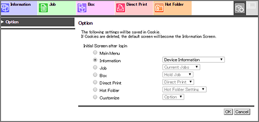 Information | Displays the [Information] tab after the login. You can select which screen in the [Information] tab you want to display. |