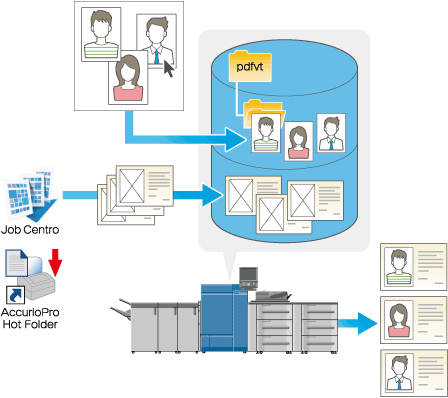 PDF/VT-2 variable printing is a method to manage only a part of a document as an external file and combine it with the document when making prints. Printing information such as the direct-mail address and ticket serial code can be changed to suit recipient conditions.