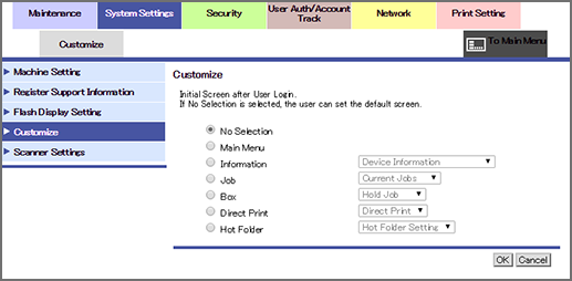 According to the work environment in your office, specify an appropriate screen to be displayed first so that user's work efficiency can be improved. For example, if the Direct Print function is frequently used on the machine, you can specify Direct Print as the initial screen.