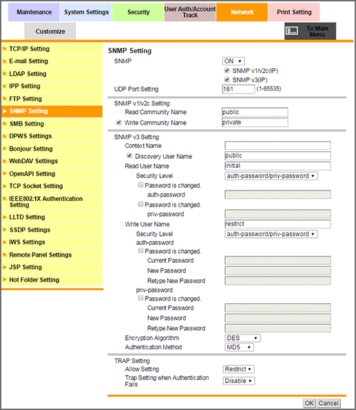 This screen allows you to configure the settings to acquire machine information or monitor the machine by using Simple Network Management Protocol (SNMP).
