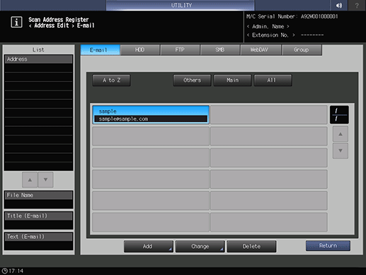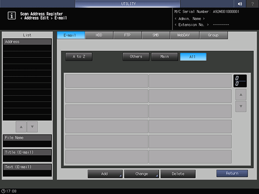 Follow the procedure on Registering a Destination and a Subject and a Message of E-mail to display the Scan Address Register Menu screen.