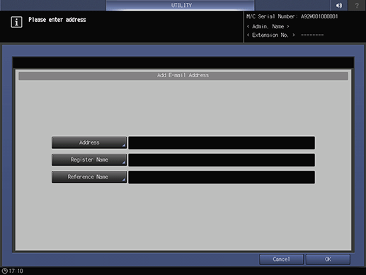 Enter information of a destination on the Add E-mail Address screen. Pressing each item displays each screen to enter characters.