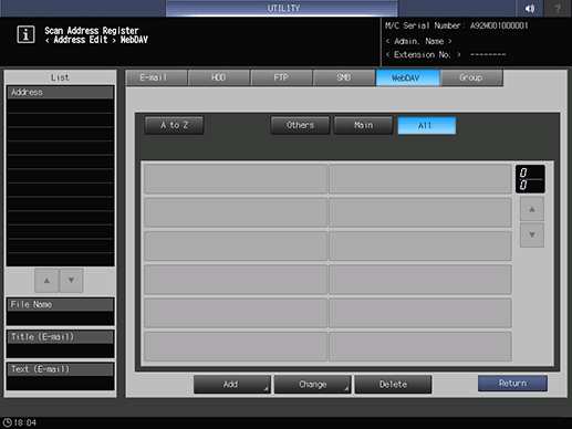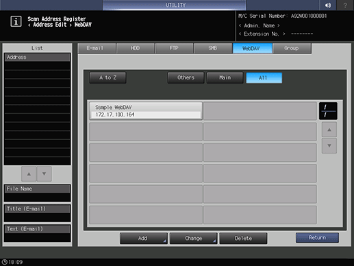 Register a WebDAV server. Sending scan data to an WebDAV server is made easy by registering the WebDAV server as a destination.