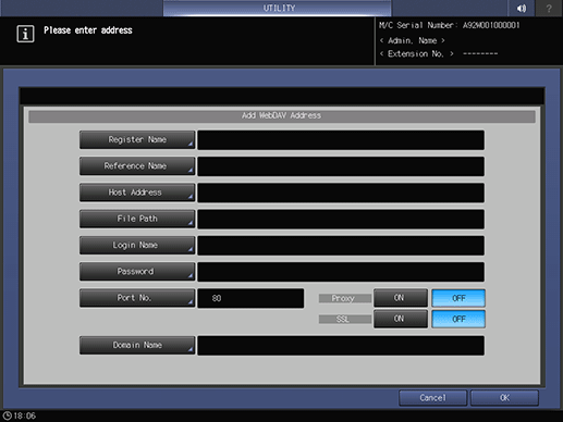 Enter information of a destination on the Add WebDAV Address screen. Pressing each item displays each screen to enter characters.