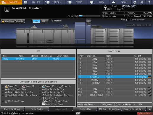 • supplementary explanationWhen the tray is replenished with paper, the message changes to Press [Start] to restart.