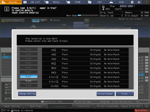 Change the paper setting of another tray (Current Setting) to that required by the print data (Reserved Setting). Load the tray with paper that conforms to specified conditions, and then start printing.