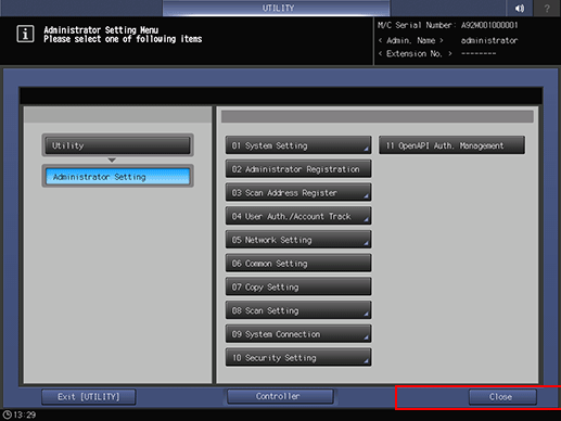 supplementary explanationTo return through the hierarchy of the Utility menu, press Close until the desired screen appears.