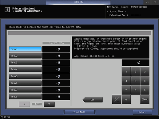 This operation is the same as that in Adjustment - Machine Adjustment - Printer Adjustment - Centering Adjustment, accessed from the MACHINE screen.