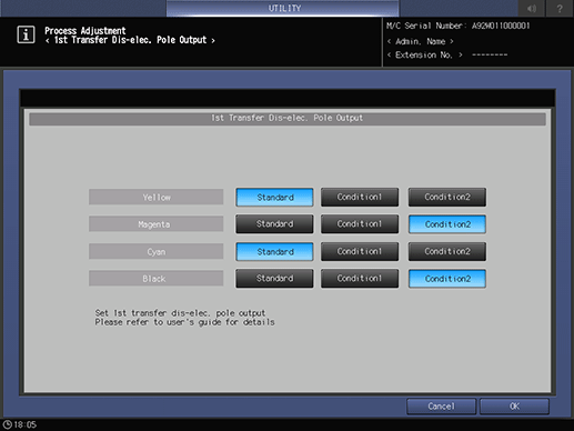 Press System Setting on the Administrator Setting Menu screen, and then press Expert Adjustment, Process Adjustment, and 1st Trans. Dis-elec. Output in sequence.