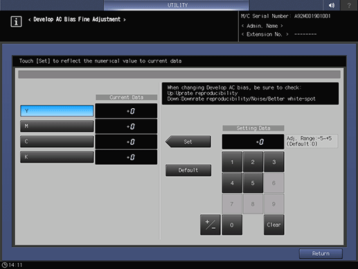 Adjust the development AC bias for each of the Y, M, C, and K colors when an image noise, white-spot, or reduction in reproducibility occurs.