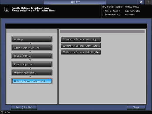 Press System Setting on the Administrator Setting Menu screen, and then press Expert Adjustment, Quality Adjustment, Density Balance Adjustment, and Density Balance Chart Output in sequence.