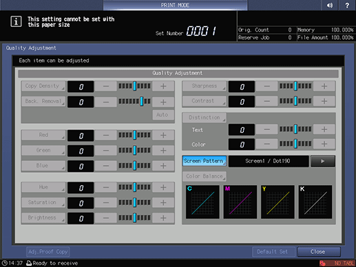 If there is no density balance adjustment data for the screen that corresponds to a job, the job is output without correcting its density balance.
