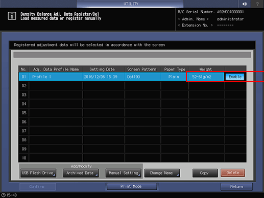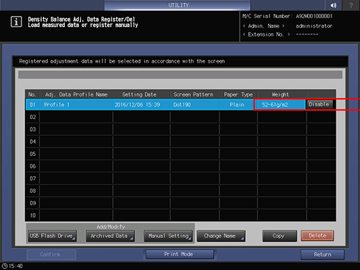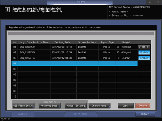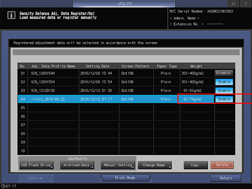 supplementary explanationIf multiple pieces of adjustment data are set for the same screen type, paper type, and weight, set Enable for the desired one. Others are automatically set to Disable.