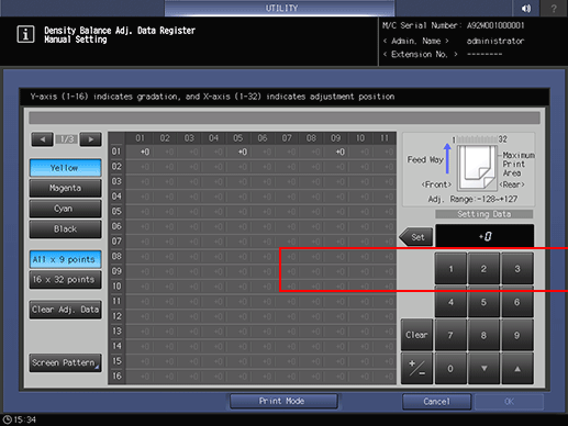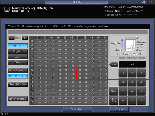 When 16 x 32 points is selected in step 11, enter the adjustment value into your desired points selected from a total of 512 points; 32 points in the crosswise direction, and 16 points in the paper feed direction.