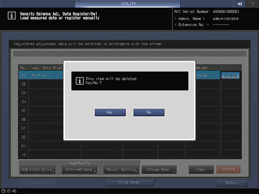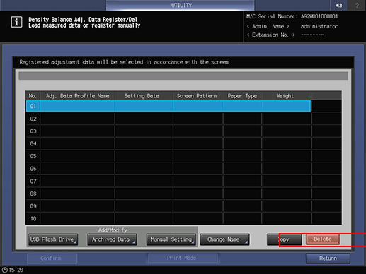 Press Density Balance Data Reg/Del on the Density Balance Adjustment Menu screen to display the Density Balance Adj. Data Register/Del screen.