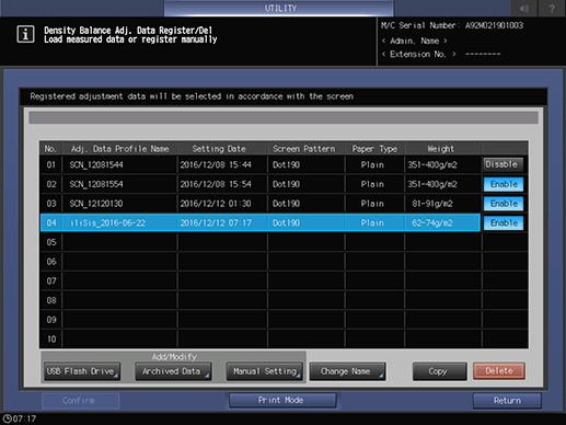 The density balance data being grayed out on the list do not function even if Enable is selected. This is because the screen type of dimmed data is not the same as that currently specified for the machine. If you select the same screen type as that displayed on the list in UTILITY, the dimmed data returns to the normal display, and it functions normally if you select Enable. For details about how to change the screen type, refer to [Custom Screen].