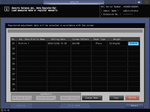 The screen returns to the Density Balance Adj. Data Register/Del screen and NEW PROFILE in Adj. Data Profile Name is displayed.