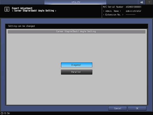 2. Press System Setting on the Administrator Setting Menu screen, and then press Expert Adjustment and Corner Staple(Back) Angle in sequence.
