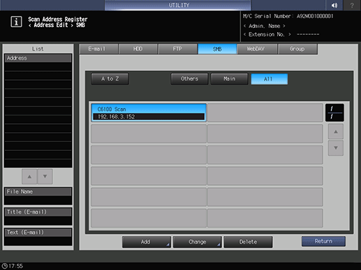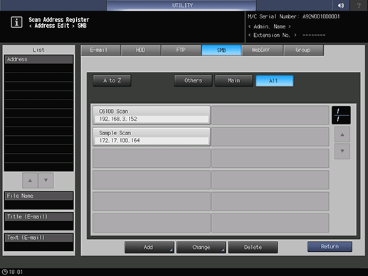 Register an SMB server. Sending scan data to an SMB server is made easy by registering the SMB server as a destination.