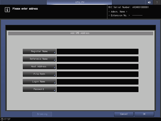 Enter information of a destination on the Add SMB Address screen. Pressing each item displays each screen to enter characters.