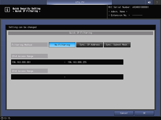 This setting is the same as that of Quick Security Setting - Quick IP Filtering accessed from the UTILITY screen.
