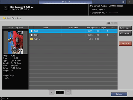 Press Security Setting on the Administrator Setting Menu screen, and then press HDD Management Setting and Delete HDD Job in sequence.