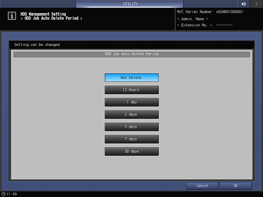 • supplementary explanationThe HDD Job Auto Delete Period screen is displayed.