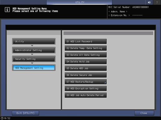 2. Press Security Setting on the Administrator Setting Menu screen, and then press HDD Management Setting and HDD Job Auto Delete Period in sequence.
