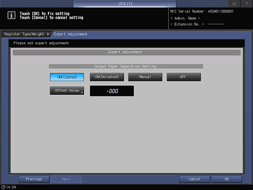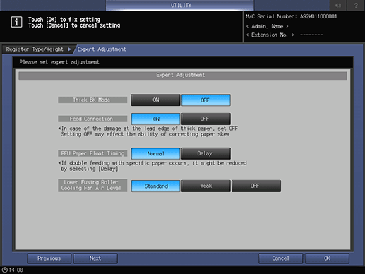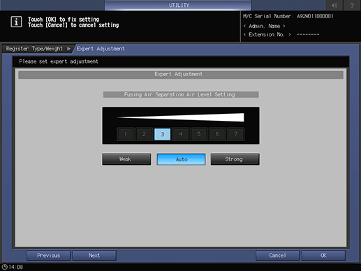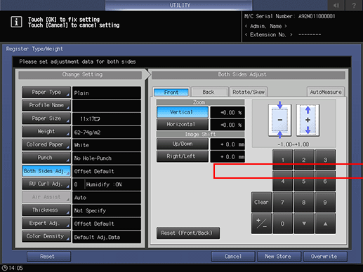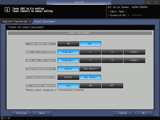 • supplementary explanationFor items from 2nd Transfer Output Adj. (Front) to Pre-regist. Loop Adj. (Front) that is displayed by pressing Next twice, select the button for the item you want to adjust and press the touch panel keypad, down, up, or the keypad on the control panel to enter values.