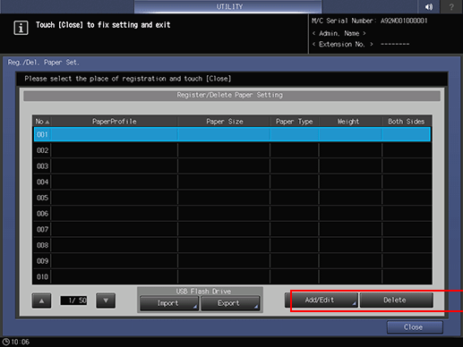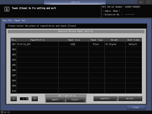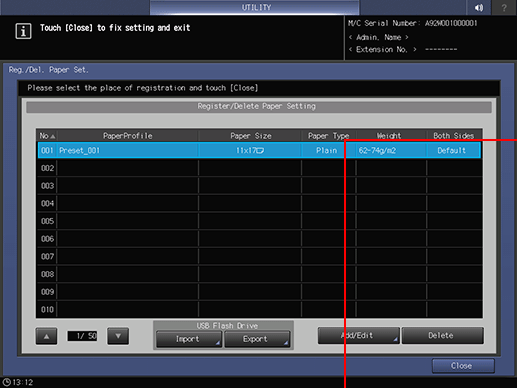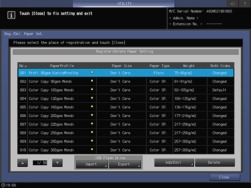 • The export function saves the entire paper setting data of a machine to a USB flash drive.