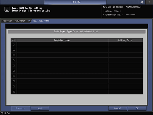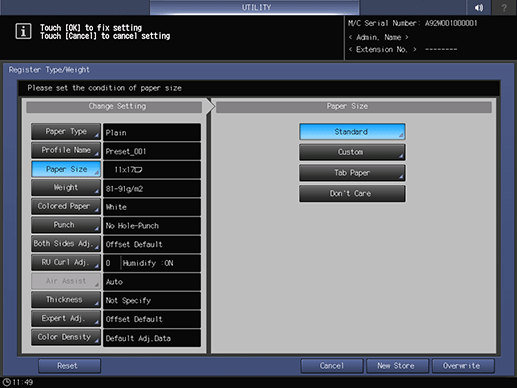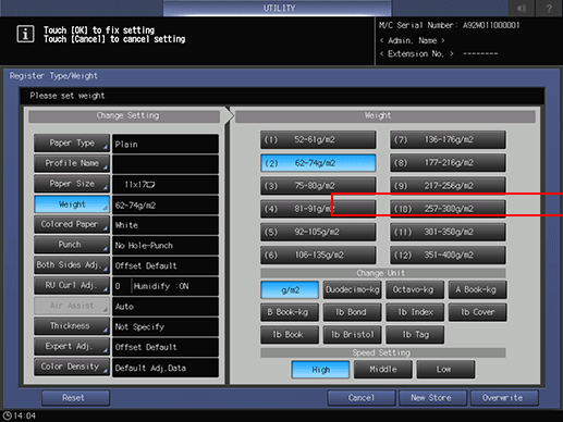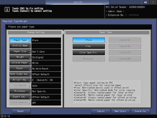 21. Press Overwrite on the Register Type/Weight screen. The screen returns to the Reg./Del. Paper Set screen.