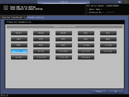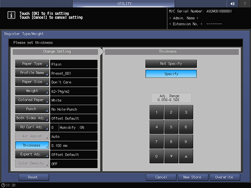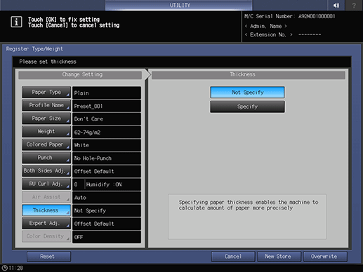 Thickness is displayed on the screen when the machine is mounted with Image Controller IC-604. Selecting Specify allows the machine to estimate the remaining amount of paper in the tray with greater accuracy.