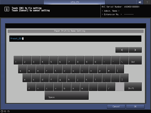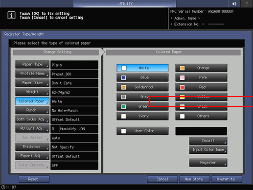 • supplementary explanationTo change the specified color name, press Input Color Name to display the Input Colored Paper Name screen and rename it.