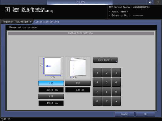 Selecting Custom allows you to enter the desired dimensions from the screen. This setting can also be made by recalling a custom size previously registered.