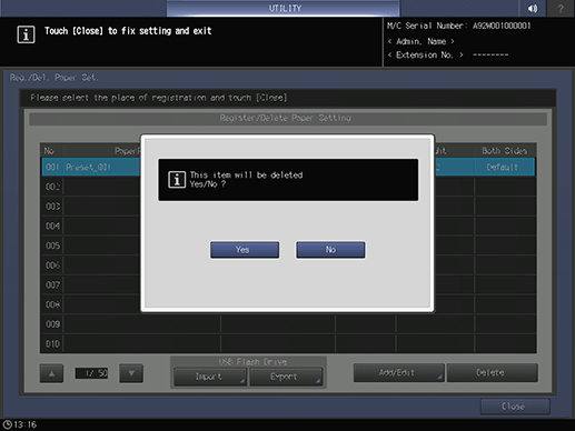• supplementary explanationThe confirmation dialog is displayed. Press Yes to confirm. To cancel, press No.