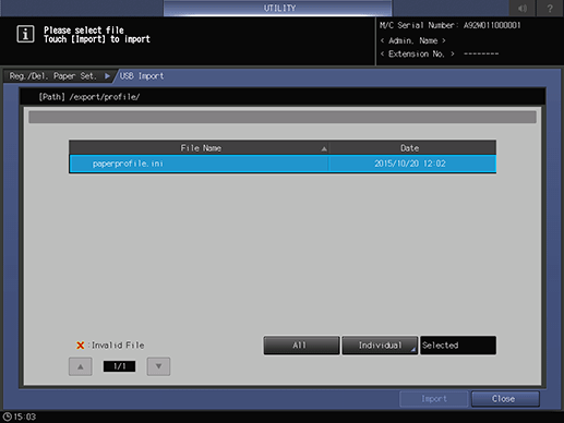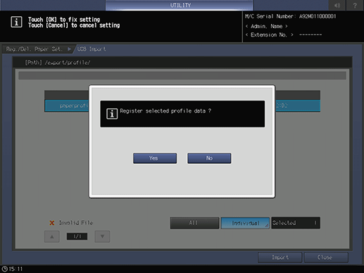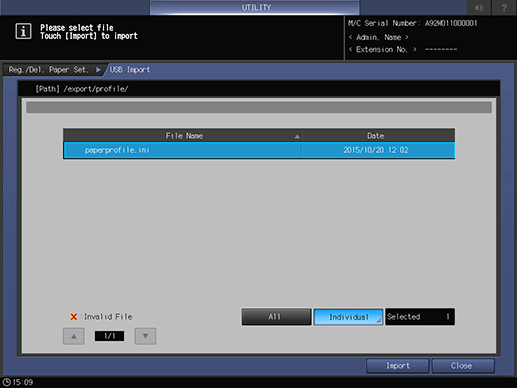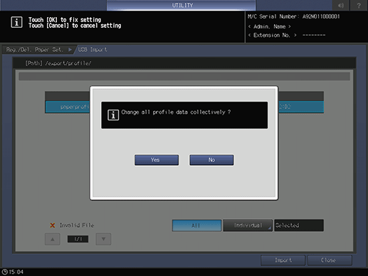 • When using the importing [All] option, all the data of paper size and paper setting stored on the USB flash drive is imported and the data registered on the machine is overwritten.