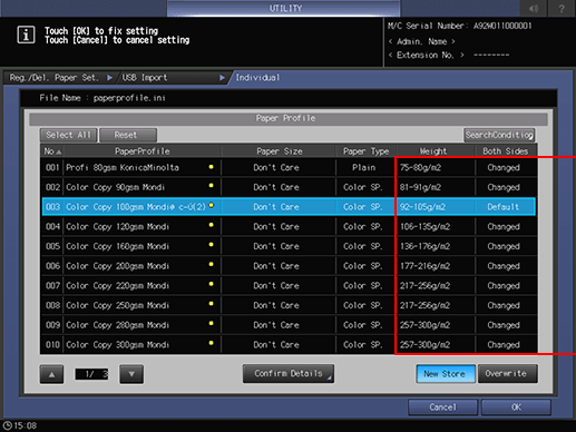 • When using the importing [individual] option, the paper setting data you select is imported and the data is newly stored or overwritten on the machine. With the [New Store] option, up to 500 data, together with the number of the data that has already been registered on the machine, can be imported. (The remaining data after reduction of the registered data from 500 can be imported.) With the [Overwrite] option, up to 500 data can be imported.